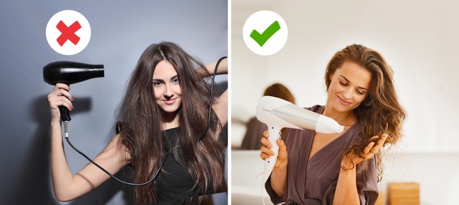 Sử dụng máy sấy tóc không đúng cách sẽ là một mối nguy hiểm cho mái tóc của bạn. Hãy thử sấy tóc theo cách dưới đây: thấm tóc ướt bằng khăn, sử dụng một ít dầu dưỡng sau đó sấy tóc từ phần chân tóc đến phần ngọn. khi tóc ướt bạn có thể dùng với sấy nóng và tốc độ cao và chuyển dần về thấp hơn khi tóc đã dần khô. Khi sắp kết thúc sấy, bạn nên chuyển sang chế độ lạnh.